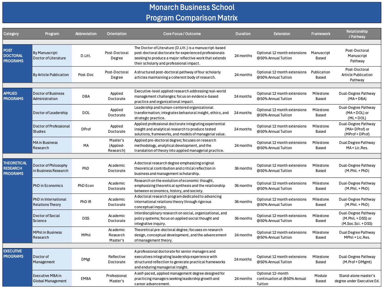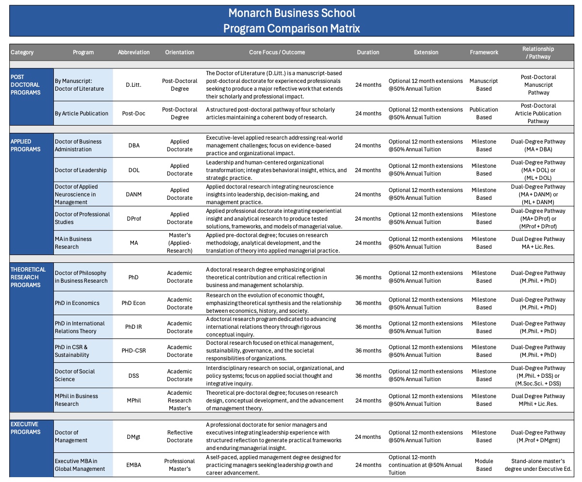 Together, these offerings embody Monarch’s long-standing mission to foster advanced management knowledge through a Doctoral Institute model grounded in research, application, and reflection.